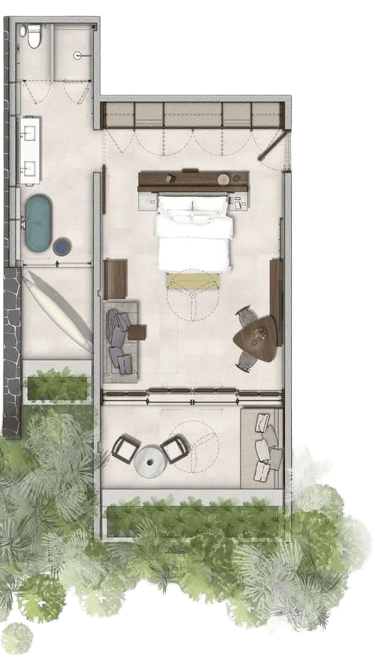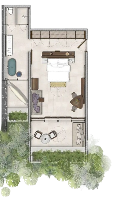 · Área de estar integrada · Coffee counter con frigobar · Balcón privado con vistas al viñedo · Orientación estratégica para luz natural · Acceso independiente garantizado